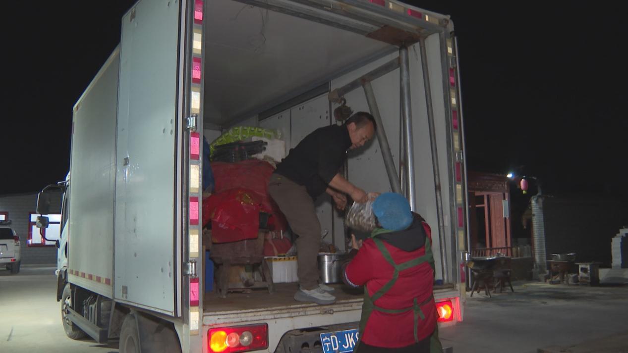 第二天早上七点,远处的山还笼在黎明前的黑影里,巩耀军和团队麻利地把食材等装上了车。随后,一辆流动餐车,两辆载着员工的小车,鱼贯驶出村口。