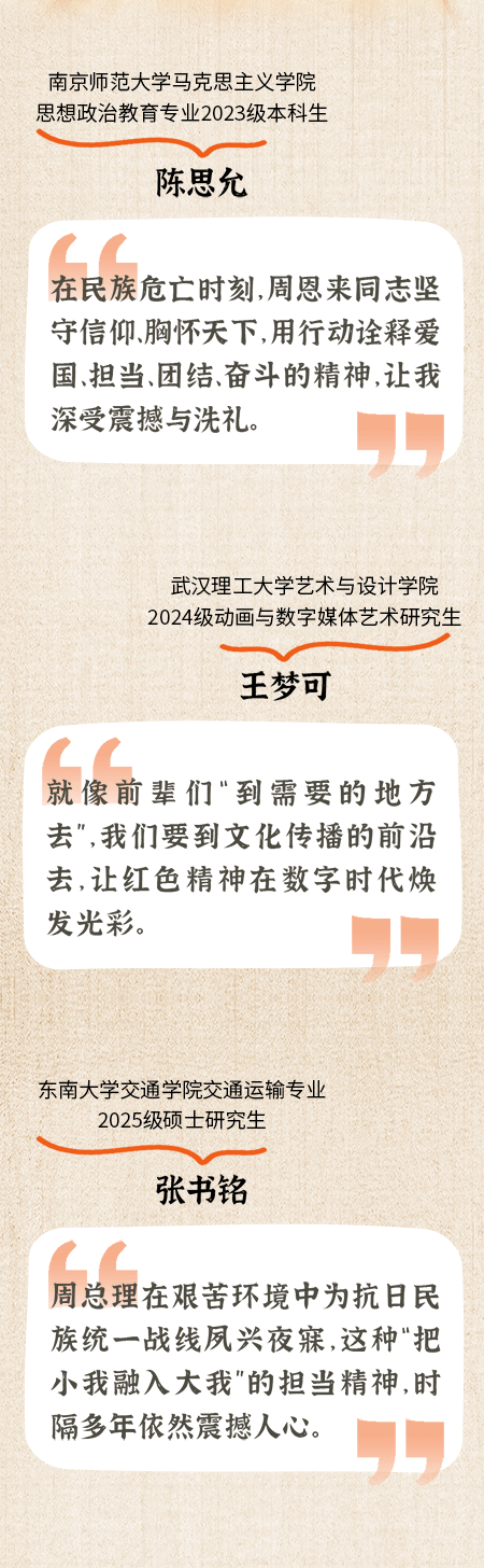 “在民族危亡时刻,周恩来同志坚守信仰、胸怀天下,用行动诠释爱国、担当、团结、奋斗的精神,让我深受震撼与洗礼。”南京师范大学马克思主义学院思想政治教育专业2023级本科生陈思允说,“走进周恩来旧居,我最深的感触是,小小一栋楼,承载着家国大义。这里没有奢华陈设,却处处是先辈为民族救亡奔走的足迹。”