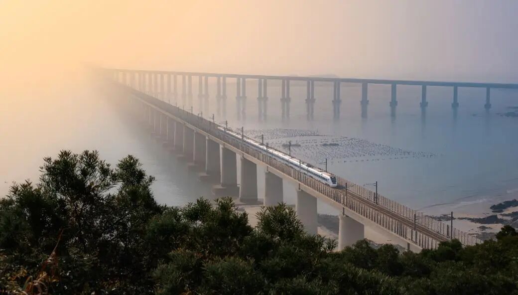 晨雾漫过海面,跨海高铁桥如淡远长虹。暖金晨光勾勒桥面,白色列车衔光疾驰。海面漾着碎金,桥墩隐于雾中,列车声与浪涛交织成奔赴希望的序曲。