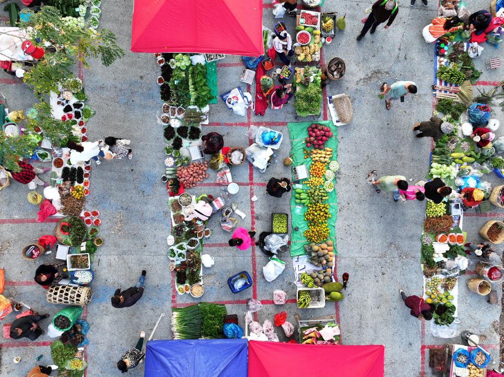 3月1日,人们在云南省西双版纳傣族自治州景洪市曼外村“山货集市”采购(无人机照片)。
