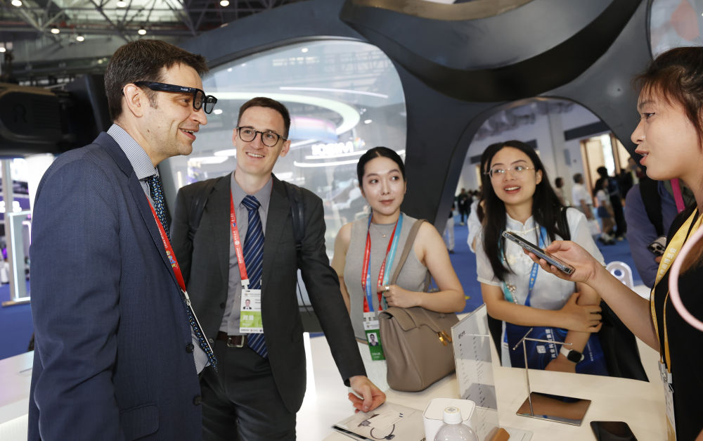 ↑ 4月14日,观众在第六届消博会科技消费展区了解科大讯飞的AI眼镜产品。新华社记者 杨冠宇 摄
