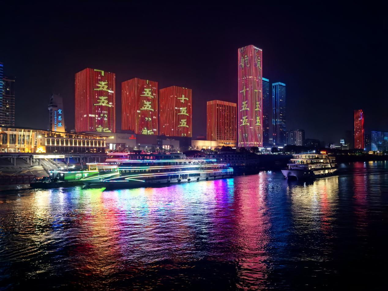 入夜,记者乘船沿江而行,两岸灯火璀璨,古韵新风的城市建筑掩映在郁郁葱葱的草木中,更显“一半山水一半城”的独特城市风貌。