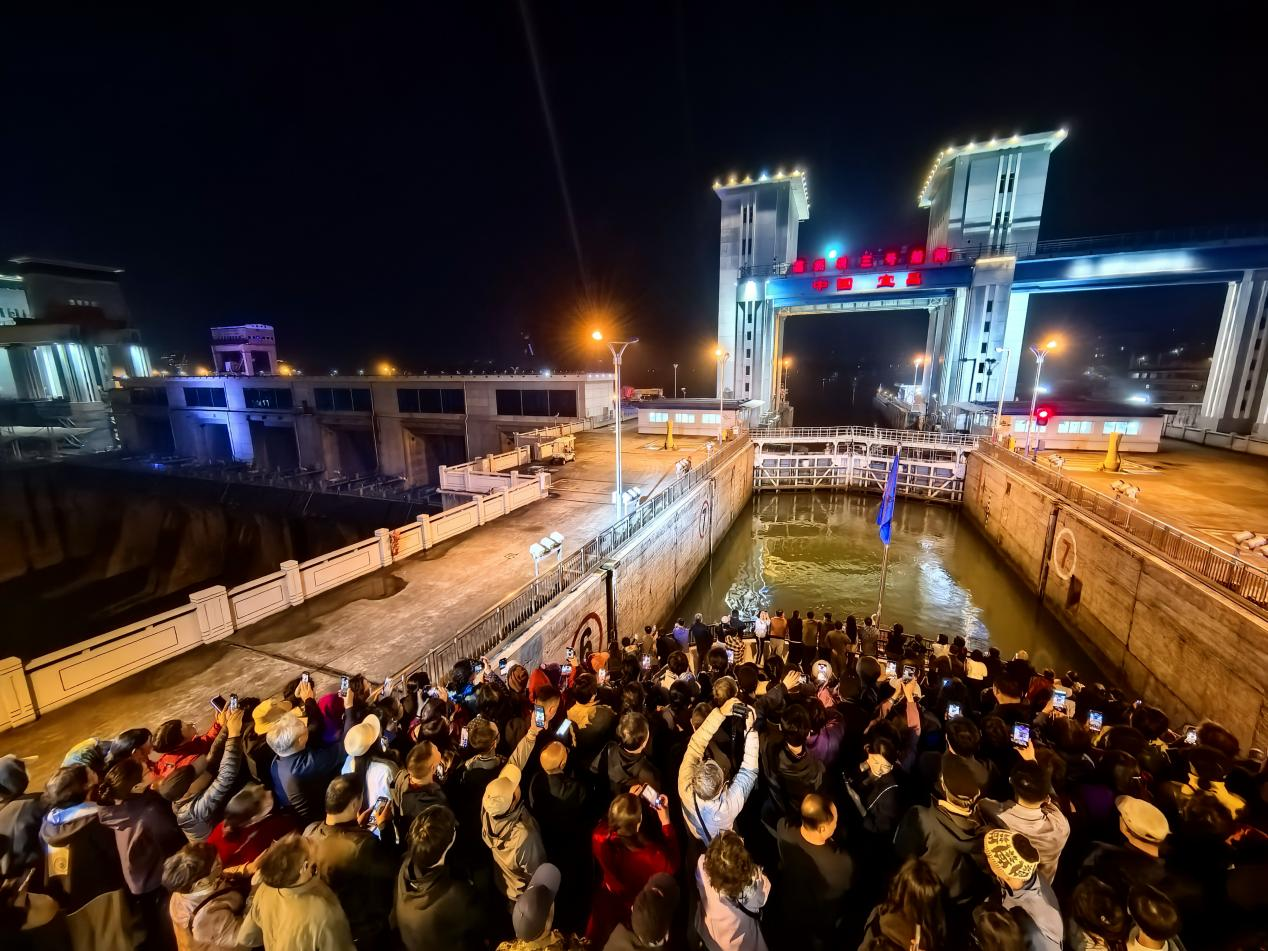 游客在宜昌乘船夜渡葛洲坝。 新华网记者 刘军 摄