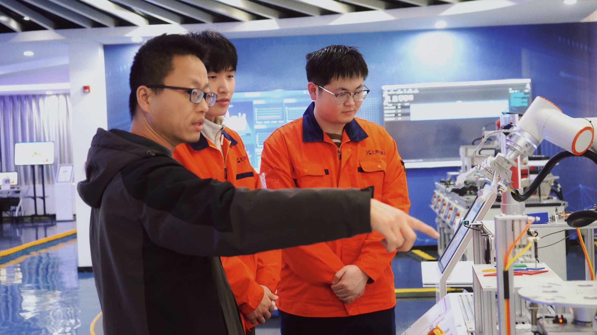 江苏汇博机器人技术股份有限公司的车间里,生产线有序运转。十几名学生身着工装,围在一台工业机器人旁。工程师刚讲完一个故障排查要点,学生们便轮流上手操作。繁忙的生产线,成了“另一种课堂”。