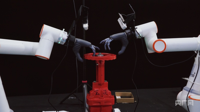 苏州大学机电工程学院实验室内,两台白色智能协作机械臂正以均匀的节奏缓缓摆动,双手握住阀门,一圈一圈地转动,动作精准稳定。学生们紧盯屏幕上的力控数据,一旁的企业工程师根据实时反馈,指导他们调整算法参数。
