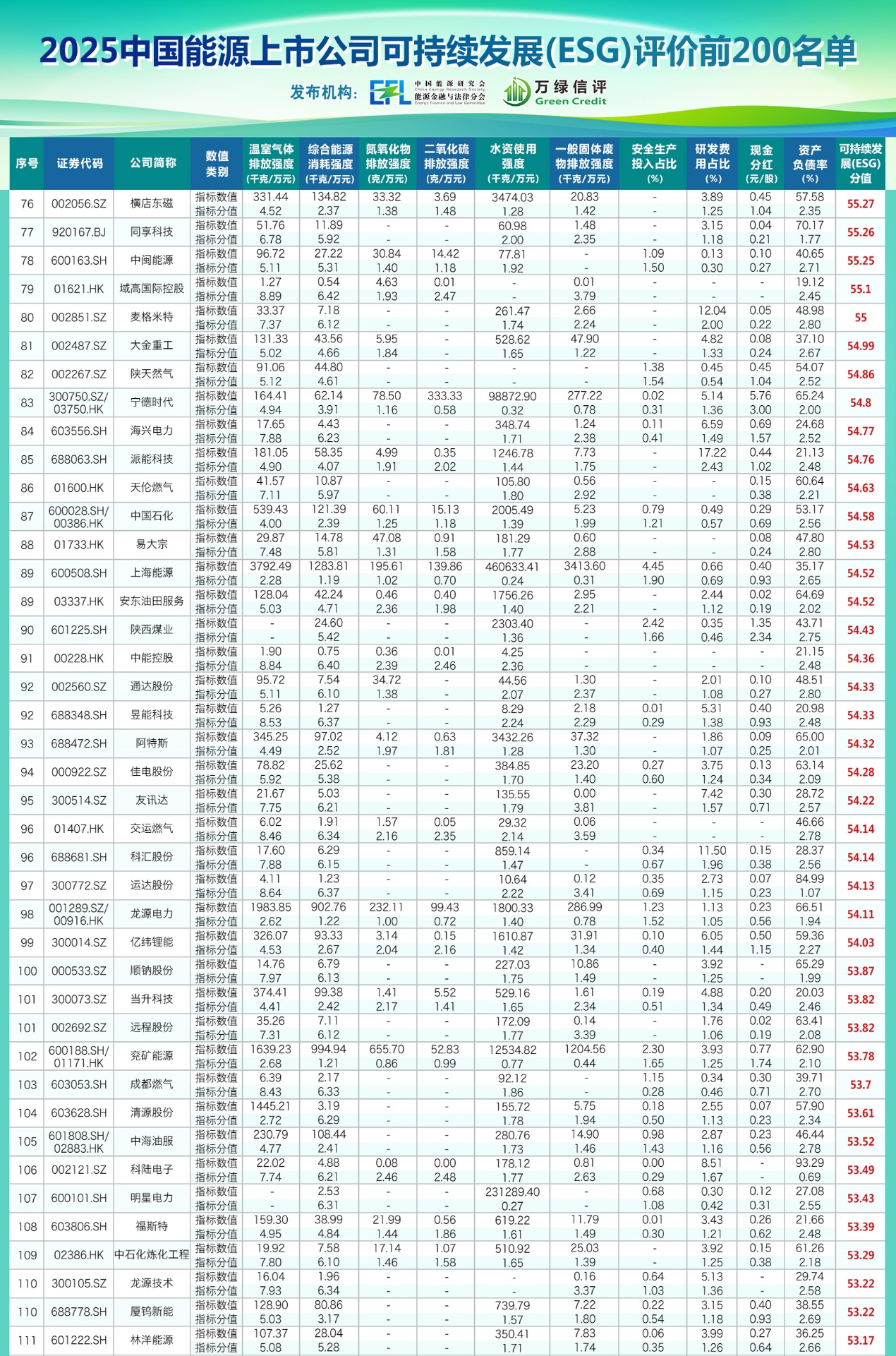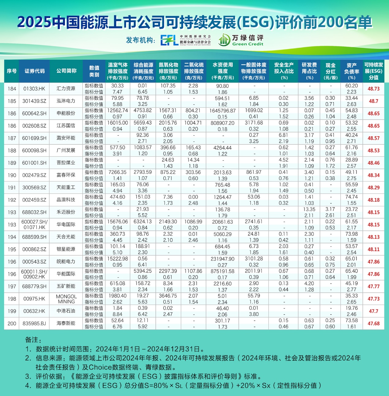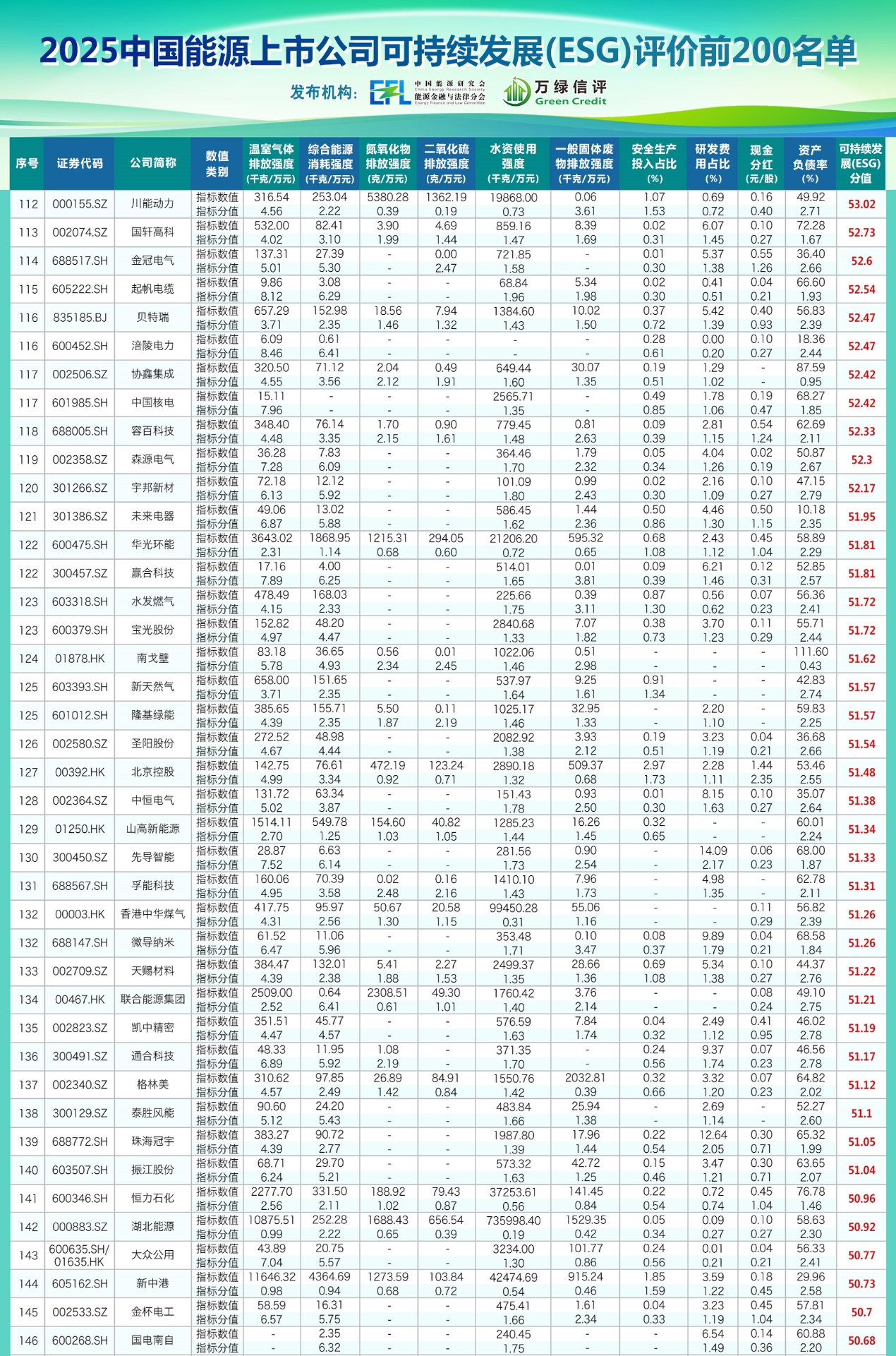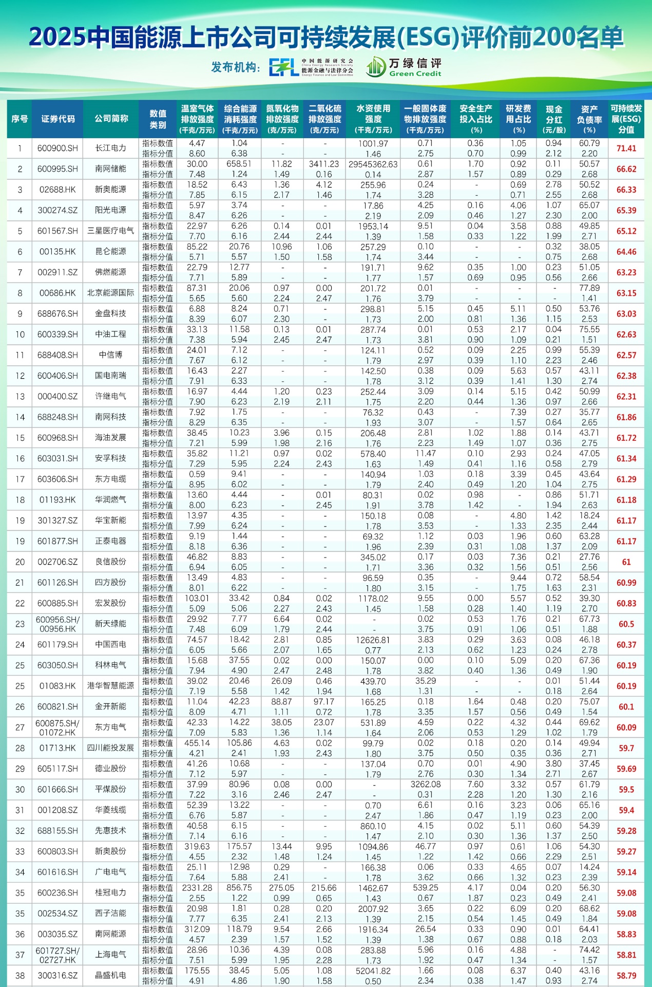 为推动标准实践应用,中国能源研究会能源金融与法律分会联合专业评级机构,对境内632家能源领域上市公司进行了可持续发展(ESG)评价,并于2025年9月发布了《2025中国能源上市公司可持续发展(ESG)评价报告》及前200强名单(见附件)。长江电力、新奥能源、阳光电源等27家公司获评最高“A”级。