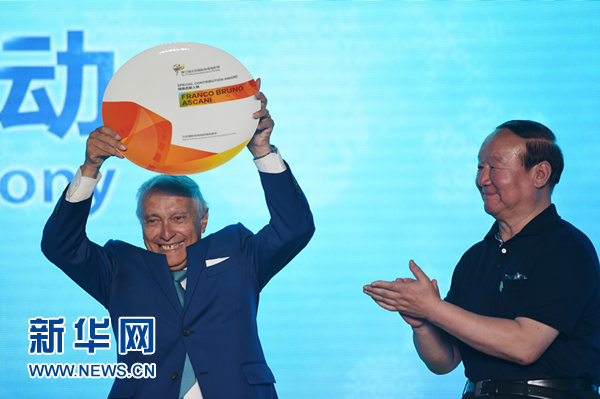 8月10日,北京奥运城市发展促进会副会长蒋效愚(右)向国际体育电影电视联盟主席弗兰克·阿斯卡尼颁发特殊贡献人物奖。新华社记者鞠焕宗摄