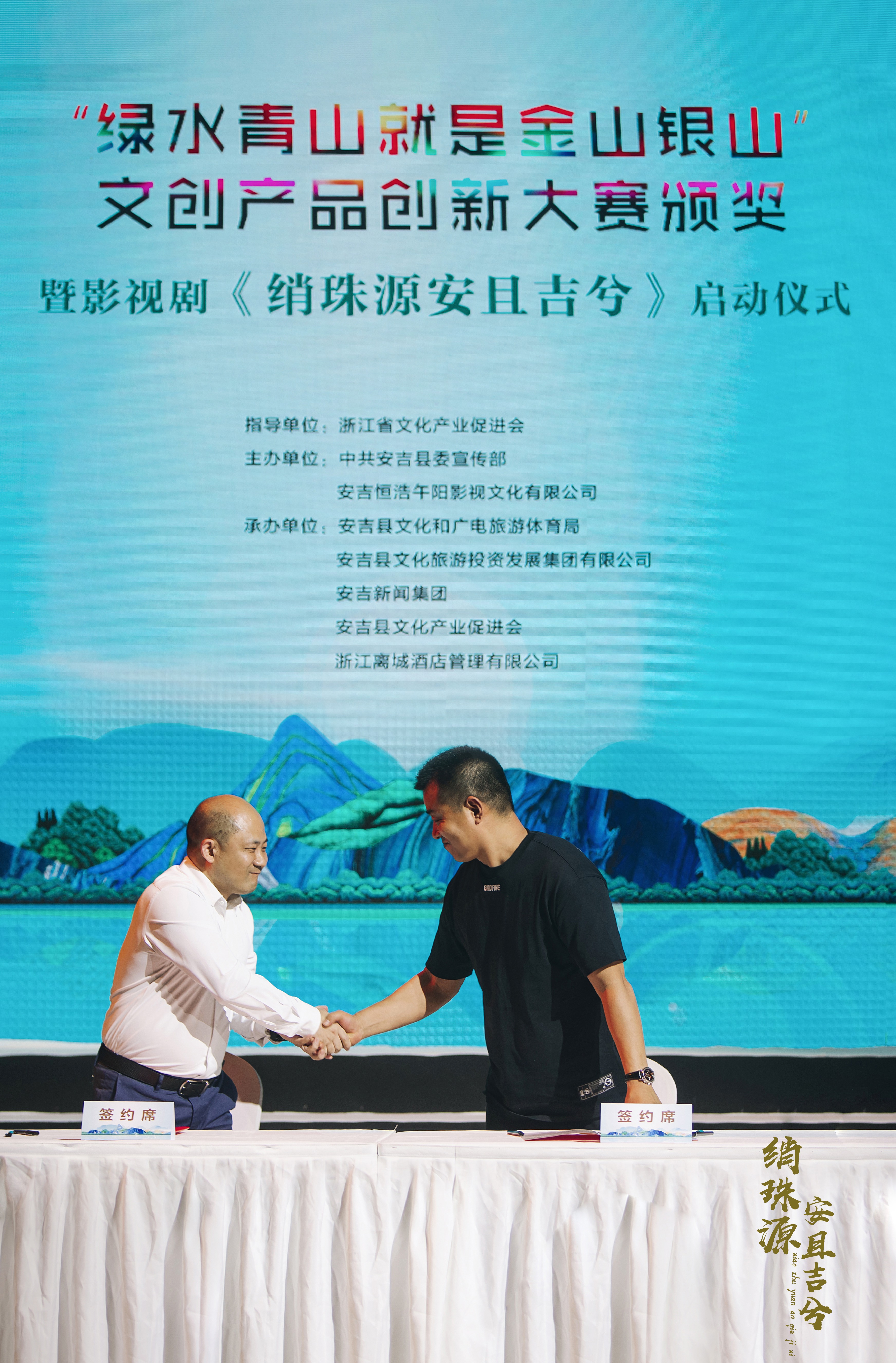 在安吉县长宋波致词后, “绿水青山就是金山银山”文创产品创新大赛颁奖环节,通过 “文创内容”与“产品载体”相得益彰, 体现安吉文化要素和背后的故事 , 恒浩午阳影视文化传媒有限公司总制片人边铁军与中共安吉县委宣传部常务副部长凌逸刚共同签订影视剧《绡珠源安且吉兮》联合出品协议,随后边铁军同浙江离城酒店管理有限公司代表王亚芬 女士 签订合作协议。