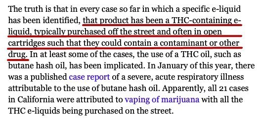 Michael Siegel在其最新的blog中指出,从目前公布的病例来看,致病的原因应该指向THC,而非电子烟——患者们普遍使用了在街头黑市购买的THC液体,而非正规渠道出售的含有尼古丁的电子烟油。事实上,今年1月的一份学术报告中,已经明确确定THC会导致严重的呼吸道疾病。在美国加州的21例类似病例中,都无一例外使用了街头黑市购买的THC液体。