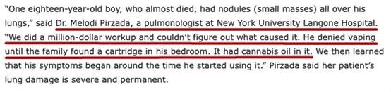 纽约大学Langone医院的MelodiPirzada医生,曾接诊过类似病例,”我们花费了100万美元给那个18岁男孩做各种检查,却一无所获,直到他的家人发现他在吸毒,并在使用含有THC成分的大麻油。THC对男孩的肺部造成了永久性伤害。“