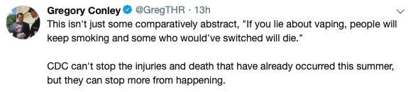 美国电子烟协会主席GergoryConley表示,CDC本可以阻止更多死亡的发生,但是他们的一些做法在加剧电子烟行业被谎言覆盖,“人们会回去抽烟,包括那些已经成功戒烟的人们,最终导致更多死亡。”