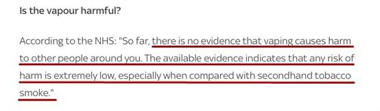 英国国民保健署称:“到目前为止,还没有证据表明,抽电子烟会对你周围的人造成伤害。现有证据表明,任何危害风险都极低,特别是与二手烟相比。”