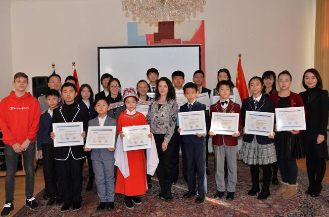 霓娜参赞(Nina Dillenz)也夸赞中国文化小使者精湛的才艺与表演,表扬同学们在传承弘扬中国传统文化,积极了解学习世界多元文化所做出的贡献。同时激励大家作为中国与奥地利两国友谊与和平的年轻使者,今后向自己的家人、同学及朋友们等更广泛的传播两国的文化与友谊。更希望小使者们有机会踏上奥地利美丽的国土,亲自去感受、去体验、去发现,与奥地利青少年共同搭建起两国长期友好交流的纽带与桥梁。