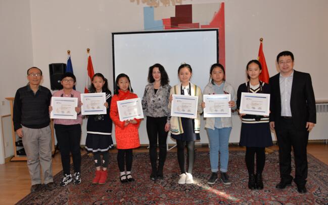 现场参赞代表奥地利驻华大使馆及活动组委会向中国文化小使者颁发荣誉证书表彰同学们在活动中的精彩展示及卓越表现