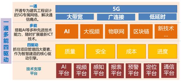 运用“一通多能四驱动”架构,结合人工智能、区块链、云计算加边缘计算、大数据等8项系统技术应用,实现实时的建造资源、安全、各施工环节的深度融合和监管。