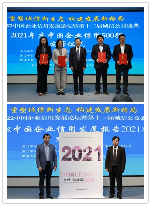 在本次诚信公益盛典上,中国企业改革与发展研究会常务副会长许金华在会上发布了2021年度“中国企业信用500强”“中国制造业企业信用100强”“中国服务业企业信用100强”“中国民营企业信用100强”“中国上市公司信用500强”等多个榜单,并为荣获2021年度信用企业和诚信企业家代表颁发获奖证书。中国合作贸易企业协会副会长兼秘书长高景远、国家发展和改革委员会对外经济研究所所长刘泉红共同为《中国企业信用发展报告2021》揭幕。该报告是由中国企业改革与发展研究会、中国合作贸易企业协会、国信联合(北京)认证中心联合组织编写,是全面、客观、真实反映我国企业信用发展状况以及经济效益变化趋势的综合性年度报告。通过对中国企业的信用发展状况进行全面、客观、科学、公正的分析研究,剖析新时代宏观经济环境新变化以及企业面临的新问题和新挑战,并提出促进中国企业信用发展的对策和建议,引导我国企业进一步提高信用管理水平和综合竞争能力。