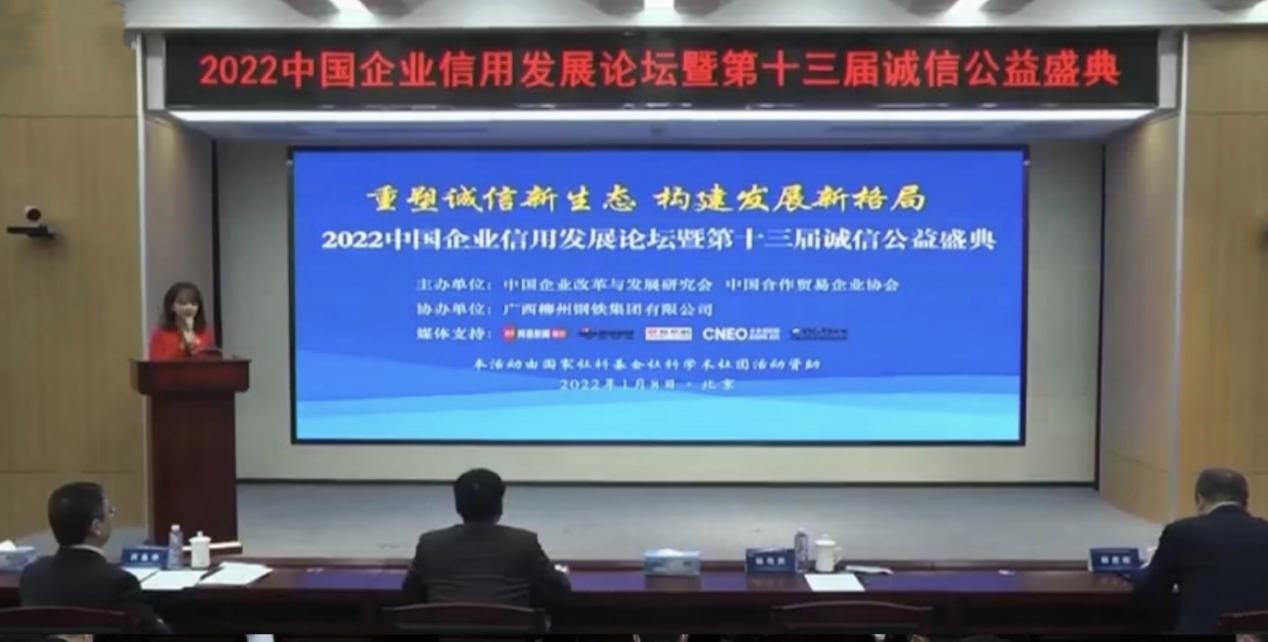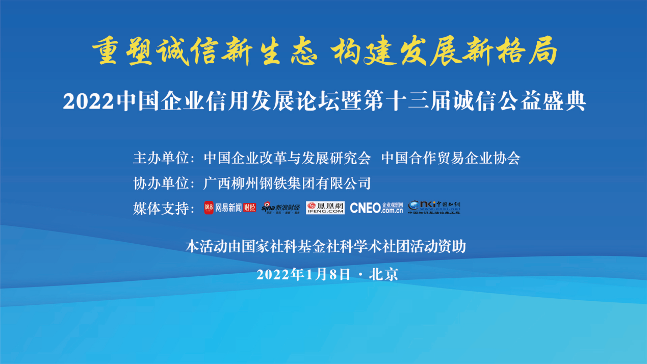 2022年1月8日,由中国企业改革与发展研究会、中国合作贸易企业协会主办,广西柳州钢铁集团有限公司协办,国信联合(北京)认证中心承办,国家社科基金社科学术团体活动资助的2022中国企业信用发展论坛暨第十三届诚信公益盛典在京隆重举行。本届论坛聚焦国内外经济形势新动向、新趋势和新政策,为政企产学研之间搭建相互交流的平台,旨在提升企业的诚信管理意识和信用管理水平,推进企业诚信建设,为构筑诚实守信的经济社会环境作出积极贡献。