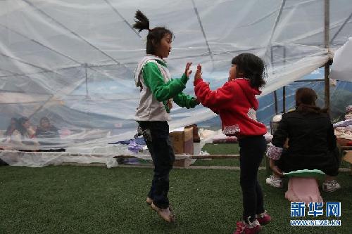 4月23日,在宝兴县城受灾群众安置点,两名小姑娘在帐篷前玩耍。当日是四川省芦山“4·20”7.0级强烈地震后的第四天。 新华社记者金立旺摄