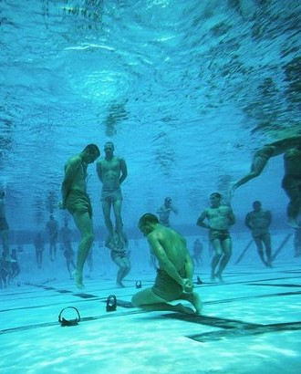 一张照片显示,一组突击队员双方被反绑在身后,自动沉到泳池底部,他们的任务就是仅用牙齿,来为自己戴上放置在池底地板上的面罩。而这些突击队员都毫不费劲、平静地完成了这项任务。不过报道称,更艰巨的训练任务还在后面。
