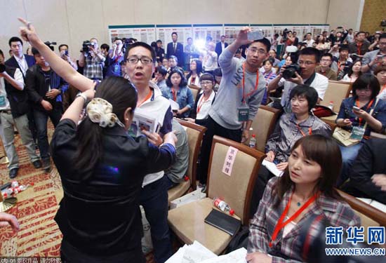 在现场记者的劝说下,持续了约三分钟的争执获得了短暂的平静,但随后另一位女记者又起来提问,现场又陷入一片混乱。