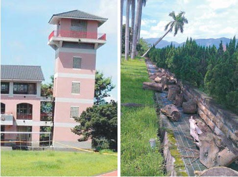 校长张瑞祥说,鹿谷中学建在边坡,已有三面地表向下塌陷,其中一面因602地震位移10公分,造成钟楼危机,还有廿间教室受损,今将和“教育部”联合会勘,讨论修复方向。