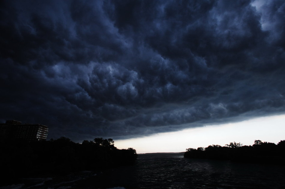 当地时间2013年7月19日,美国纽约州尼亚加拉大瀑布景区,随着阵阵强劲的大风,一片呈现墨黑色的阴云滚滚而来。原本阳光灿烂的大瀑布景区周边顿时变成了暗夜,随后是电闪雷鸣大雨滂沱。这个变化怪异而迅速,很多游客认为似乎是世界末日来临般神奇,众游客纷纷逃离景区。