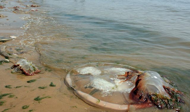 8月5日,河北省秦皇岛市,在北戴河浅水湾浴场内,游人们被许多搁浅在沙滩上的水母所吸引。这些水母大的直径有半米多,看上去新鲜艳丽,只是游客们不敢上前触摸。据当地人讲,这么多这么大的水母出现在北戴河,以前还没有出现过。水母是一种水生物,有些种类有毒,如果不小心被蛰伤有很大危险性。游人在海中嬉戏时要尽量避开它们,更不能轻易触碰打捞。