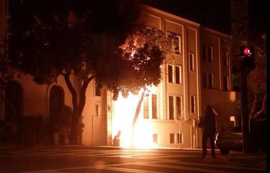 当地时间2014年1月1日21时25分,中国驻旧金山总领馆遭纵火,嫌疑人拎两桶汽油泼向总领馆正门并点火焚烧,致领馆正门严重损毁。旧金山警察局、消防局及美国国务院外交安全局等部门迅速赶到现场处理,目前案件正在侦破中。图为总领馆正门起火。