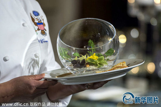 此次宴会在白宫花园举行,共有4道菜肴。第一道菜是来自美国伊利诺伊州河口的奥西特拉鱼子酱,配上来自宾夕法尼亚州的鹌鹑蛋,以及来自纽约州、爱达荷州以及加州农场的数十种马铃薯。第二道菜是生菜沙拉,配小萝卜和胡萝卜,上面浇上红葡萄酒调料,它们被放置在玻璃碗中,就像玻璃花园。