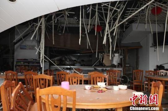 记者在现场看到,爆炸造成的冲击波将楼层的窗户炸裂,窗户的框架结构已经变形,在爆炸现场和楼下,都是玻璃渣,饭堂桌椅散落一地。