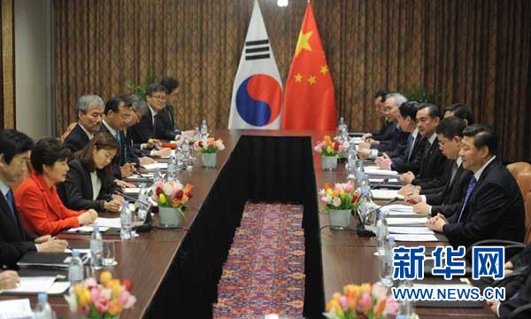 两国元首还就朝鲜半岛形势交换意见。习近平指出,中韩在半岛问题上有着共同的利益和关切。双方都致力于实现半岛无核化,都希望半岛保持和平稳定,都坚持通过和平方式解决问题,双方开展协调合作契合点很多。今年以来,半岛形势总体保持缓和势头,南北关系得到一定改善。中方积极评价朴槿惠总统提出的“半岛信任进程”,希望南北双方着眼长远,保持耐心和定力,不断推进和解合作进程,最终实现自主和平统一。朝核问题错综复杂,需要综合施策。各方应该抓住半岛形势相对缓和的契机,争取早日重启六方会谈。