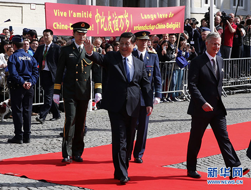 4月1日,国家主席习近平离开比利时布鲁日市启程回国。离开前,比利时国王菲利普在布鲁日广场为习近平举行隆重欢送仪式。 新华社记者鞠鹏摄
