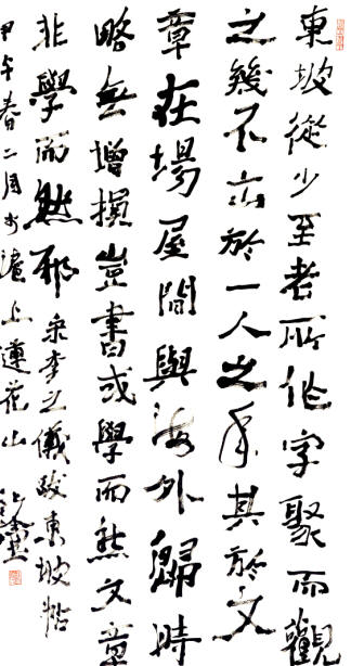 化涂广临碑帖,诸体兼擅,其书法结架古朴方正,线条使转流利,严正时则显端庄,灵动处不失俊美,不拘传统程式,显示一种新的艺术气象。他的篆刻,结字严谨,用刀古拙,刚锋柔锋相济,金石味十足。他探索以紫砂器具为载体以制印,成为另类印谱,这次他与宜兴紫砂工艺名家银之合作的五十印紫砂笔筒便是一种前无古人的尝试。他喜爱作诗,他的诗中有画意,画中也多诗情。