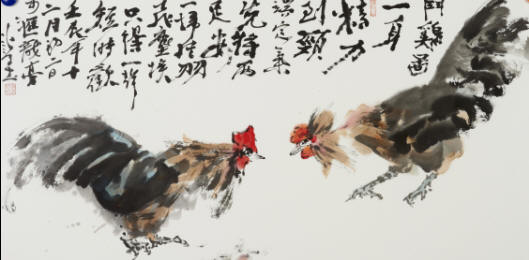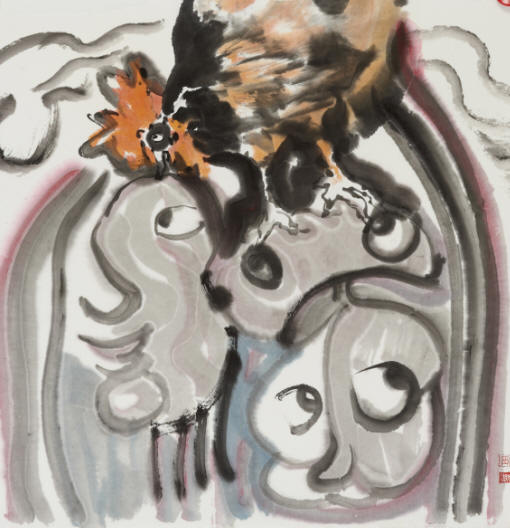 化涂的国画学习汲取八大山人、吴昌硕、齐白石、李可染等大师巨匠的艺术思想和笔墨技巧,追求意境淡雅,落笔淋漓放逸,构图疏密有致,情趣清新盎然。这次展出的戏曲人物、传统山水花鸟和抽象水墨画三类绘画作品便展现了他在继承传统上的创新追求。他的戏曲人物画,墨色华润,造型奇趣,注重人物性格与内心世界的揭示。他的抽象水墨画既源于传统的笔墨艺术,又植根于当代中国的社会生活,体现对生命、对社会的体悟和思考。如《较量》,表现禽流感带给人类的思考,传递人与自然和谐共处的理念。