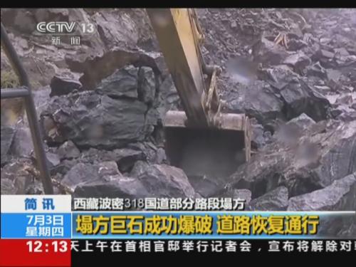 西藏波密318国道塌方巨石成功爆破 道路恢复通行