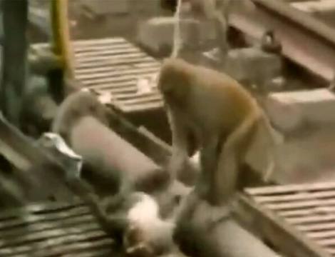 实拍猴子被铁轨电晕 同伴将其丢入水沟晃醒