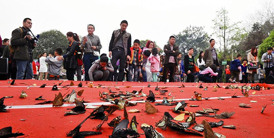 3月28日下午,成都一家家居商场在清水河公园举办了一场主题活动,主办方策划了压轴戏——“放飞蝴蝶”,引爆了数千围观市民的热情。不过,蝴蝶放飞后,大量蝴蝶停落在舞台上,遭兴奋的市民和孩子追逮,这一幕让主办方和不少人觉得十分心疼。
