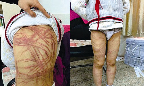《南京晨报》援引知情者消息称,男童曾告诉老师,身上的伤是父母用水管或树枝条抽打的,脚上的伤是被蒸汽烫的,脸上的伤是钢笔戳的。男童所在学校教导主任称,这次被打,是孩子读《木偶奇遇记》后,妈妈问故事讲了什么,孩子说不上来,于是就用跳绳打他的背,用水管打他的脚。