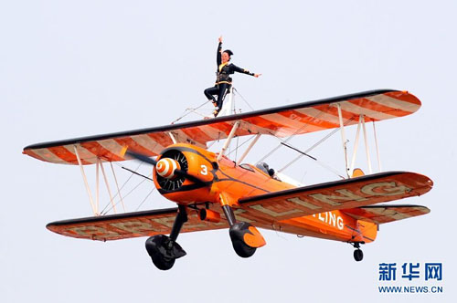 9月26日,在2015郑州航展上,百年灵空中漫步飞行队驾驶20世纪40年代的活塞式敞篷双翼飞机,和在机翼上的进行特技表演的女郎一起进行了精彩绝伦的“云中漫步”。新华社记者 李博 摄