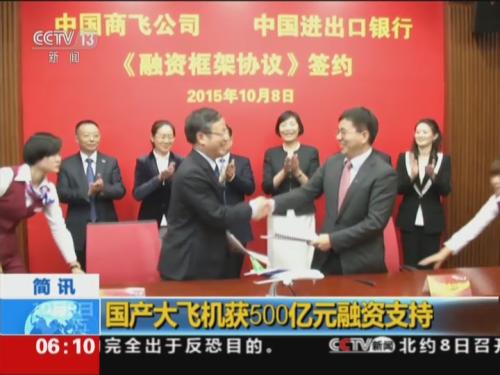 新华网北京10月8日电(记者姜琳)中国进出口银行8日与中国商用飞机有限责任公司签署500亿元人民币的融资框架协议,以支持国产民用飞机研发、制造及销售环节的资金需求。
