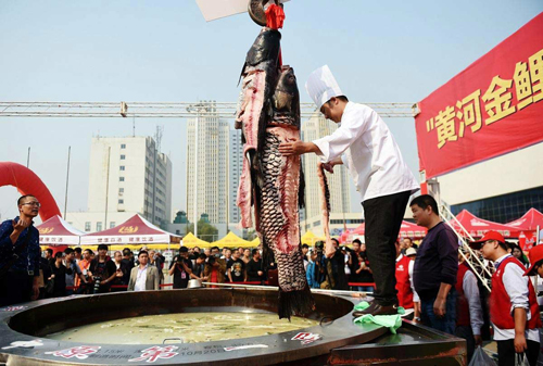 10月17日,河南省郑州市,2015中原美食节在中原国际博览中心开幕。一个直径3.15米,深0.7米,可容纳3吨高汤的“中原第一锅”现场烹煮火锅盛宴,环卫车上水,起重机吊起161.2斤鱼王下锅,吸引众多市民围观品尝。