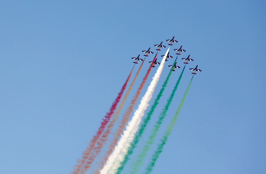 11月8日,在阿联酋迪拜马克图姆国际机场举行的迪拜航展上,一支来自意大利的飞行表演队进行飞行特技表演。