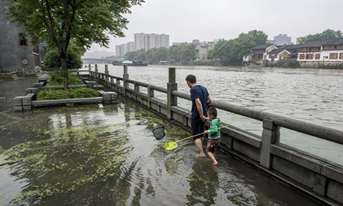 京杭大运河水位上涨 杭州市民下水捞鱼