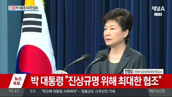 据韩联社11月4日报道,韩国总统朴槿惠于当地时间4日上午10时30分,针对亲信崔顺实干政事件发表对国民谈话,再次表示真心道歉。朴槿惠表明,已经做好在必要时接受检方调查的准备,甚至愿意接受特别检查组调查。朴槿惠在讲话中否认加入“邪教”,并表示不会中断国政运营。