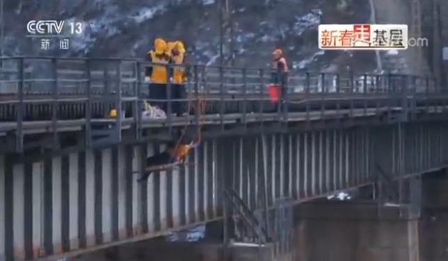安全绳栓住一块 3 米长木板,悬挂桥底, 36 岁的李玉斌坐在木板上进行除锈作业,秋千哥的名字因此而得。
