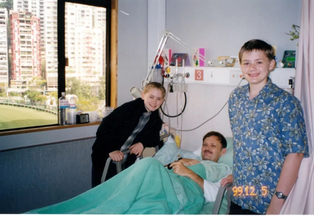 1999年潘维廉在香港一家医院接受癌症手术,和家人在一起。
