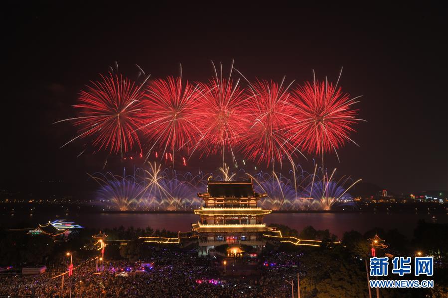 湖南长沙橘子洲的焰火与长沙城区的杜甫江阁交相辉映(5月1日摄)。 新华社发(陈泽国摄)