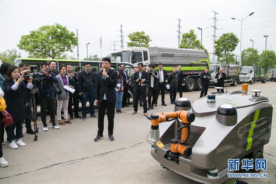 长沙中联重科环境产业有限公司的工作人员展示一款 智能清捡保洁 机器人(4月28日摄)。新华社发(陈思汗摄)