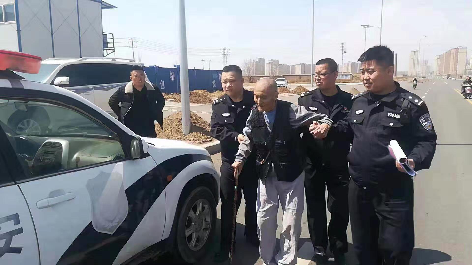 正在梁大爷全家人着急不已时,九原公安分局赛汗派出所第二警组民警却在路边偶遇了梁大爷。当时已经是晚上10点多了,三位民警巡逻至九原区市政大楼东侧世纪东路时,远远就望到路边有一位步履蹒跚的老人,天气这么冷,老人却独自一人,拄着拐棍在路边徘徊……