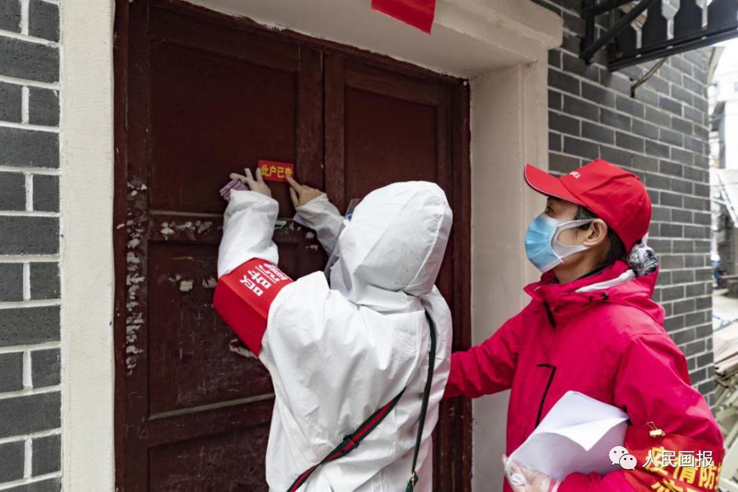 姚女士(左一)和汪女士是武昌区中华路楚材社区的志愿者和网格员。她们在社区已经排查过的每户居民大门贴上“此户已查”标签,说明社区已经和此户居民建立联系,对该户的健康情况已经了解清楚。摄影 陈建/人民画报